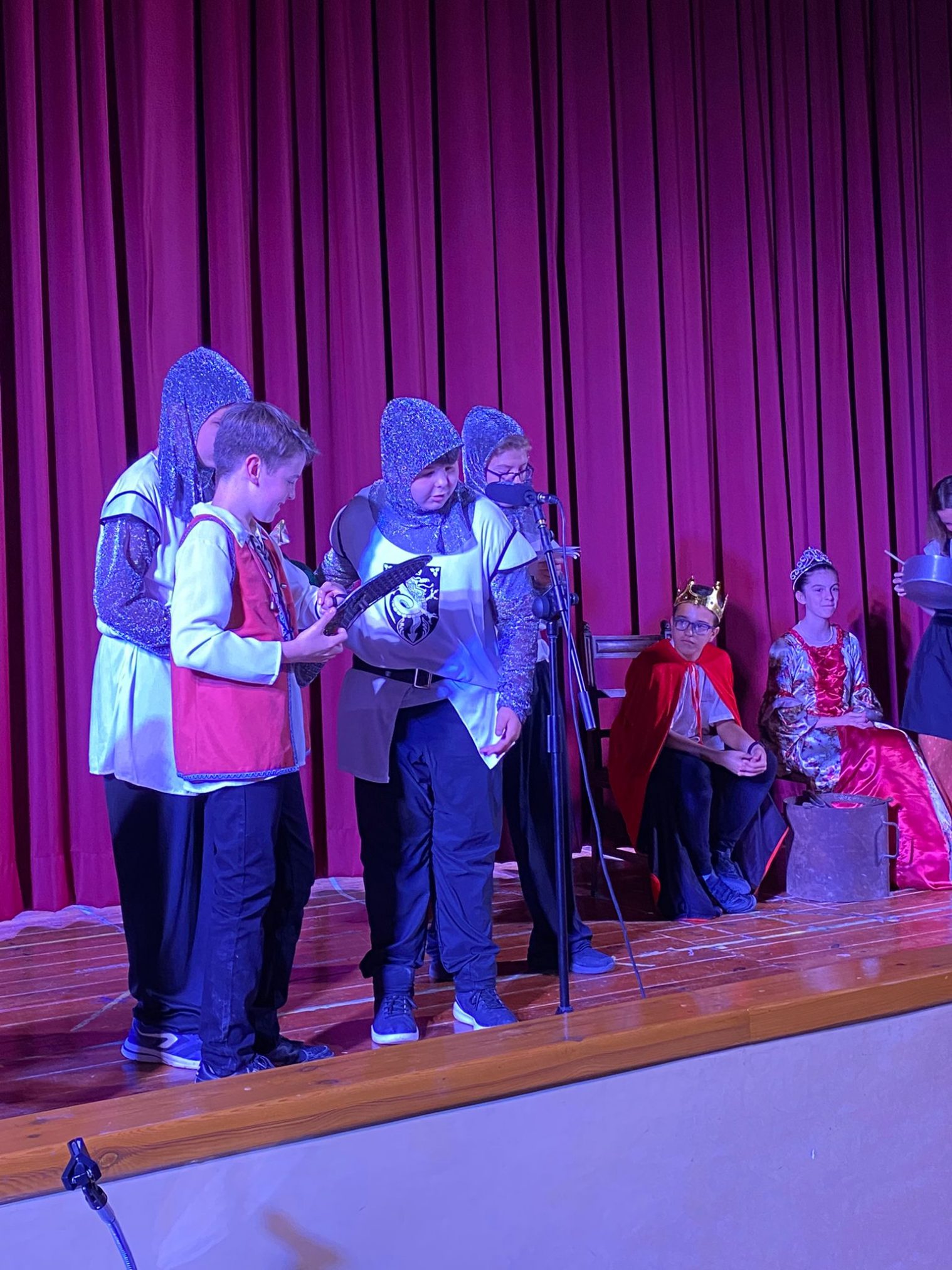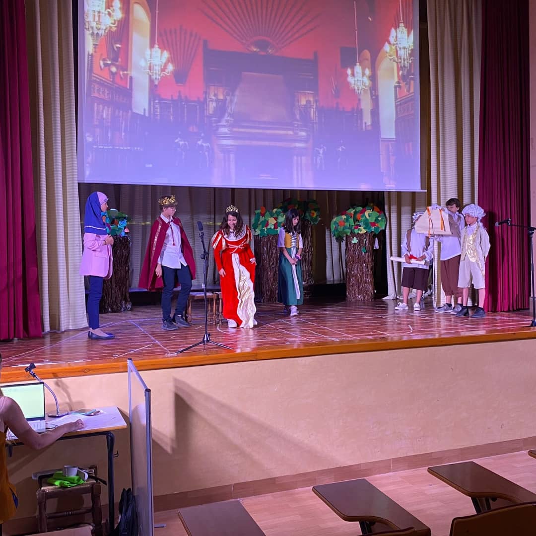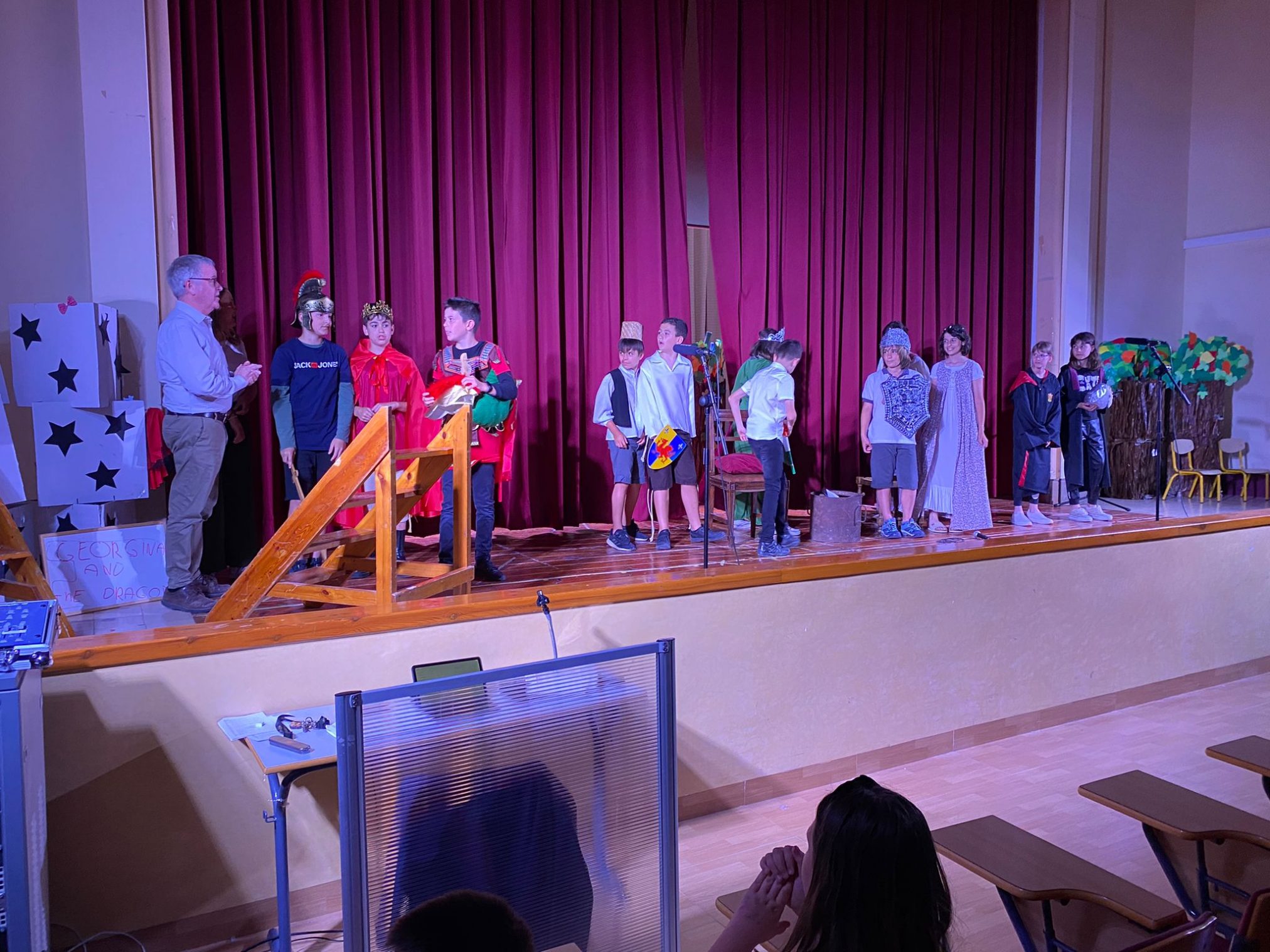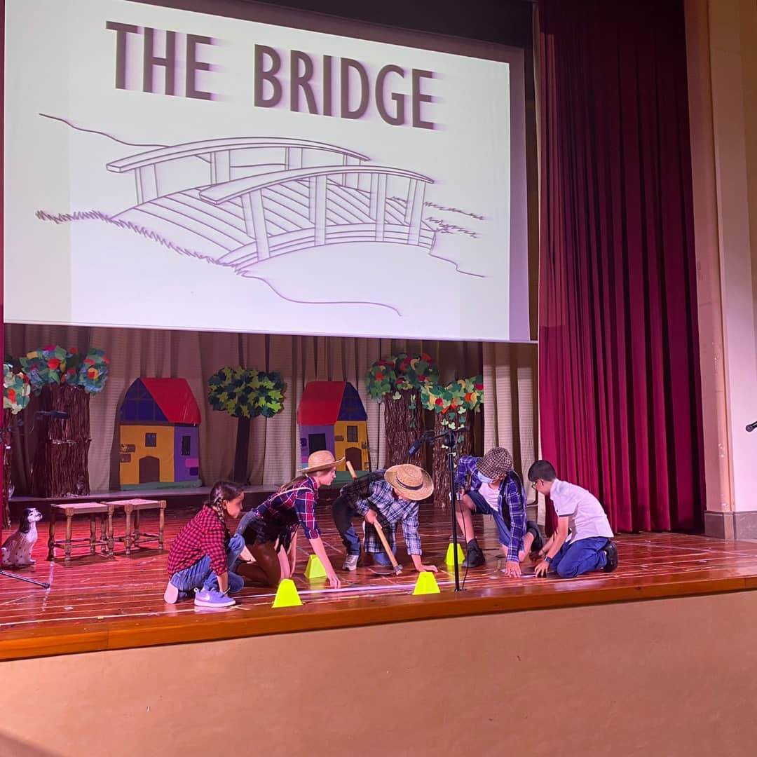 A 5è han representat THE BRIDGE, que explica la història que un pagès i la seva família troben la seva vida tranquil·la pertorbada per representants de diferents ministeris del govern que volen millorar una zona rural construint un pont. El sentit comú vola per la finestra a mesura que els documents oficials de la política es segueixen servilment per proporcionar al pagès un pont nou i totalment innecessari. L’alumnat de 6è ha representat GEORGINA AND THE DRAGON: Amb el regne aterrit per un drac que escup foc, el rei emet desesperadament una crida d’ajuda. Com que no hi ha cap, excepte el menys que impressionant príncep Jodrel, correspon a Georgina assumir el repte. Malauradament, Georgina és la cuinera reial acabada de nomenar i no és gaire millor que el desafortunat príncep. Tanmateix, amb una recompensa de mil peces d’or que s’ofereixen, la parella improbable almenys ha de fer un esforç.