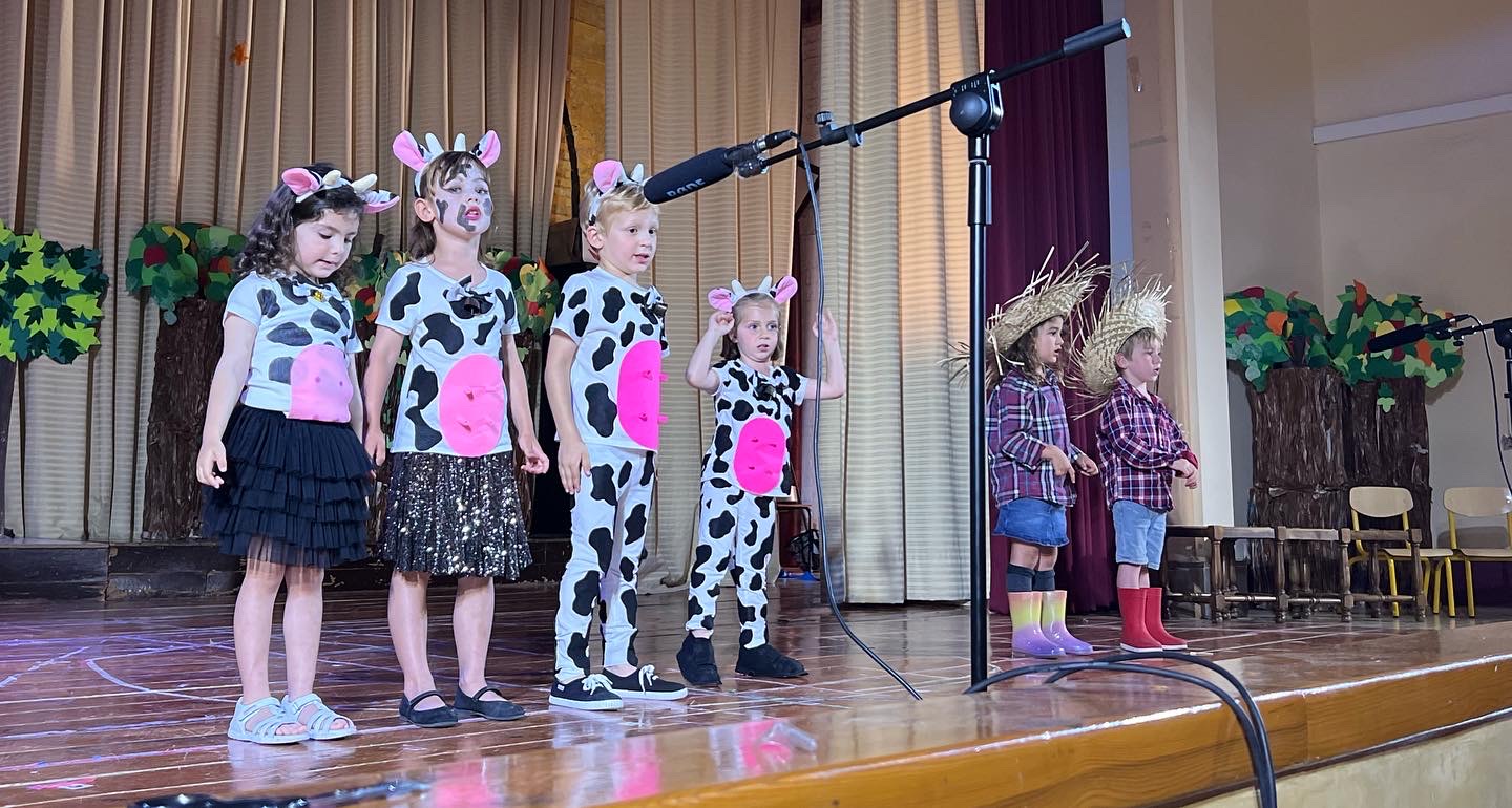 A Infantil, l’alumnat de P3 va portar a terme l’obra anomenada LA GRANJA DE L’ÀVIA PEPA. Es tracta d’una iaieta que vivia en una granja i cada matí despertava els animalets i els preparava l’esmorzar. Un dia l’àvia no es desperta… tots els animals intenten despertar-la però no hi ha manera. Fins que un dia arriba un mosquit i la desperta! Pel que fa a l’alumnat de P4 i P5, han dut a terme l’obra anomenada FLORINDA, LA VACA PALLASSA. Aquesta era una vaca somiadora que volia ser pallassa i no volia viure a la granja amb la resta de vaques. Un dia el circ arriba a la ciutat i marxa per passar a ser pallassa per sempre més.